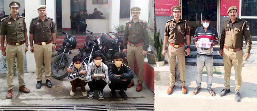 GREATER NOIDA NEWS: ग्रेटर नोएडा के थाना बीटा-दो पुलिस ने एक सूचना के आधार पर 3 शातिर वाहन चोरों को गिरफ्तार किया है। इनके पास से पुलिस ने चोरी की तीन मोटरसाइकिल, एक चाकू बरामद किया है। इन बदमाशों ने एनसीआर में वाहन चोरी की दर्जनों वारदातें करनी स्वीकार की है। इसके अलावा थाना फेस-2 पुलिस ने चोरी करने वाले एक अभियुक्त को गिरफ्तार कर उसके कब्जे से चोरी के 11 मोबाइल फोन, 1 चेन, 1 मोटरसाइकिल व अवैध शस्त्र बरामद किया है।